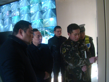 图为检查组在黄土岭隧道所监控室检查消控设备