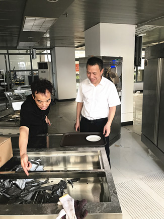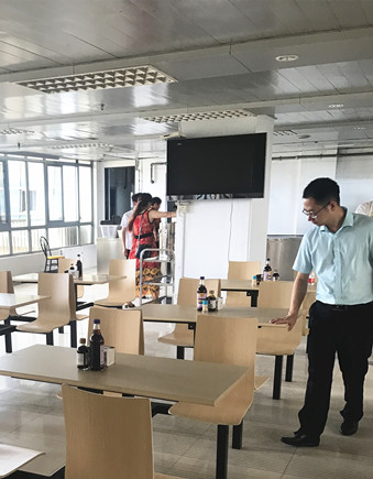 图为公司副总经理董阿林于7月1日到大楼检查指导食堂整改情况
