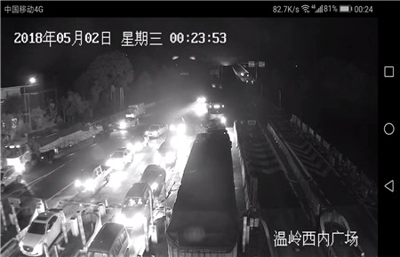 5月1日8:27分,黄土岭隧道发生多起多车追尾现象,事故现场仿佛贪吃蛇,二车追尾、三车追尾、四车追尾,特别是四车追尾现场,除了追尾车辆车头凹陷变形,被撞车辆车尾面目全非外,一辆白色SUV更是被后车顶到前引盖上,3名司乘人员受伤。隧道所监控员洪慧雯不断切换镜头,向指挥中心、医院发出报告;早已到达的隧道所执勤队已在现场维持秩序,引导后方车辆通行,为交警、急救和施救车辆开通生命通道;与此同时,台州、台州南和温岭西收费所暂时关闭宁向入口。