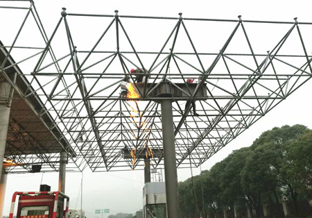“起吊”,随着现场施工管理人员的一声令下,两台吊机吊着钢结构网架缓缓升起。“往左一点,慢一点”经过近十分钟的努力,在施工现场管理人员的准确指挥下,吊机驾驶员轻轻地把钢结构网架准确无误地放在预定支架上,温岭西收费车道钢结构网架成功完成吊装。接下来施工人员陆续在网架上铺设面板,安装标志牌、照明、监控等设备,并对岗亭机电进行调试。