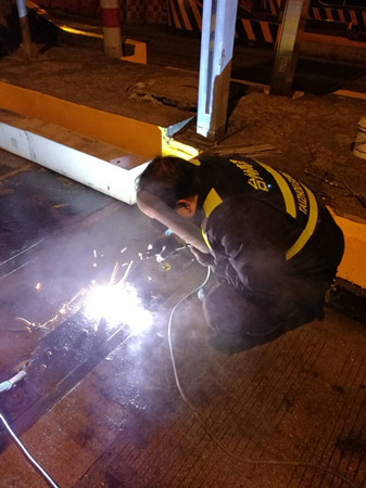 到了现场,队员发现该车道轮检器铁板螺孔由于不断摩擦并逐渐变大,导致整颗螺栓脱离底下固定螺座,加之当天是春节高速免费第一天,车辆经过时车速都较快,直接将整块铁板带离底座。如果不及时对铁板进行加工恢复,不仅不能保护下面的轮检器,而且还有可能造成车辆爆胎。可除夕夜全部加工厂都已关门,如果让厂家发货至少也要好几天。正在两难之际,中心副经理叶俊想到将铁板与底座边缘直接焊死的临时应急方法,待节后再向厂家定制或重新购买。 方案有了,大家兵分两组,一组去中心仓库拿电焊机、电焊条等设备,一组待在原地清理铁底下方於泥等杂物,为随后的电焊工作做准备。设备到位后,叶俊一手操起电焊罩,一手熟练的将电焊条点在了铁板与底座边缘之间,经过近一个小时的处理,轮检铁板与地面底座牢牢地固定在一起,再也不用被飞驰而过的车辆带离。 项寅晓
