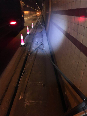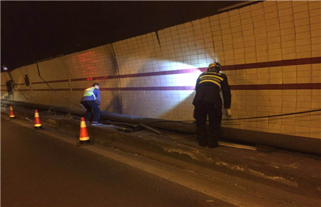 此时此刻,维养中心值班同志已经马不停蹄地奔往现场,中心负责人从临海速度赶往现场。经检查,挂落电缆系汽通门控制线,不影响隧道内照明、通讯系统的正常运行。当机立断,决定采取临时加固的紧急措施,及时联系协调交警部门,请求封道施工的帮助和支持。