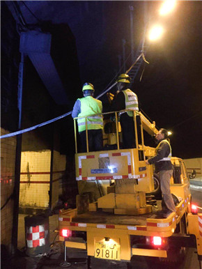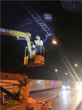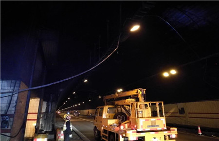 图为施工人员维修电缆 当天早上8时左右,交警开始组织实施封道抢修。作业期间,大溪岭隧道所坚守在北洞口卡口预警,维养中心班员和专业抢修人员对桥架、挂落的电缆和被撞的摄像头进行了应急处理与临时加固。此时,过往车辆已堵到大溪收费所,这时候,时间就是速度,速度就是通车效率。