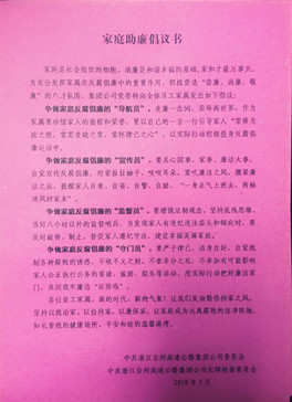 为充分发挥员工家庭成员在党风廉政建设中监督预防的特殊作用,根据集团“廉政教育月”活动要求,5月30日,监察室向全体员工发放了一封以“传承好家风,共建廉之家”为内容的《家庭助廉倡议书》,让廉洁文化走进家庭,成为家庭美德,更好地发挥家庭成员在廉政建设中的特色作用。