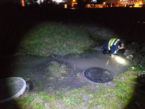 当晚19点左右,正在参加周一学习夜的中心队员接到台州南收费所电话,告知副站一根地下水管爆裂,附近积水较多。接到抢险指令后,队员们火速赶往现场查看,发现漏点位于外广场绿化施工区域,周边堆满了泥土,底下不停地涌出白花花的水,并向草坪两边流淌,形成了多个水坑。