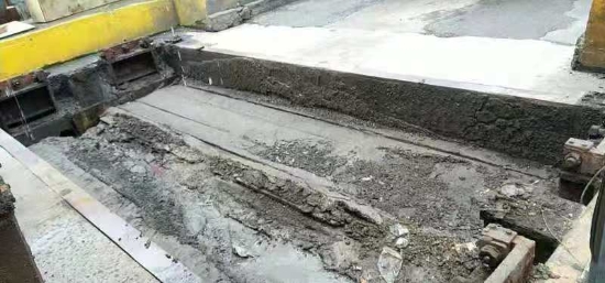 图为清理淤泥现场 为了尽量减少清淤施工对车辆通行影响,施工前,维养中心根据各站不同时段车流情况,合理安排清淤顺序。当天早上8点不到,吊车早早在台州收费站外广场待命,待施工人员一到,便开始起吊称台。当吊起称台的那一刻,大家都惊呆了:底下淤泥不仅厚达十几公分,而且非常结实,需用锄头和铁撬等工具翻松,再铲到小车上,仅一个车道清理出的泥巴就有整整一小货车。等清理完毕,中心队员还用高压水枪对底部基坑及称台部件进行了全面清洗,随后配合施工人员将称台复位并进行调试。由于准备工作到位,人员配合默契,台州收费站的两个车道称台仅用了两个小时便全部完工,恢复正常通行。