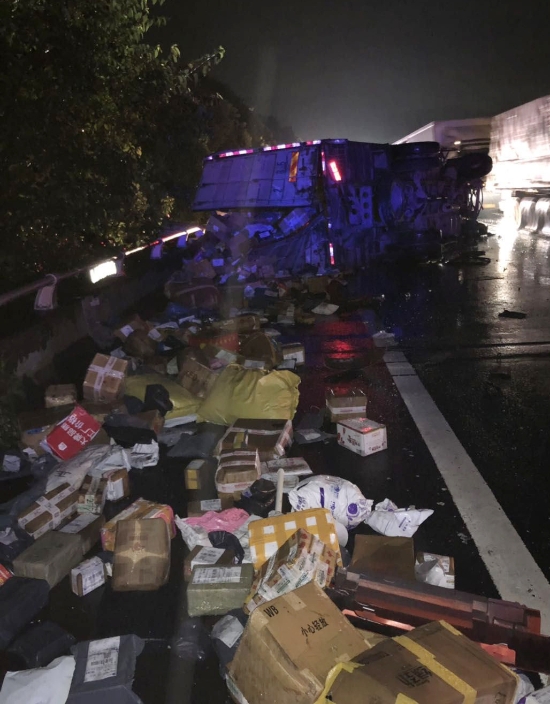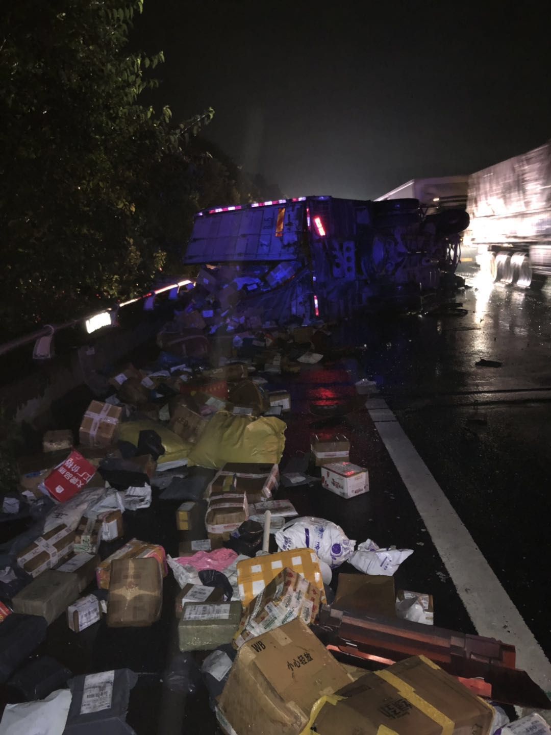 7月14日凌晨1点,温州方向台州南收费所附近,一辆半挂型大货车和一辆快递车相撞,半挂车直接冲出高速,四脚朝天。快递车则是被巨大的冲击力撞向了硬路肩,侧翻中撒下数十米的货物。1点10分,救援车辆到达现场,现场一片狼藉,防撞护栏板、护栏柱损伤严重,桥梁钢管都折断了不少。