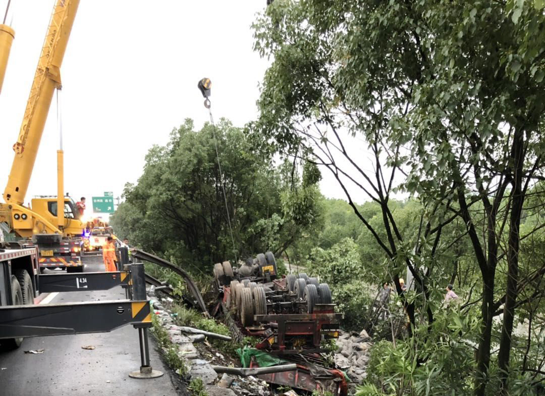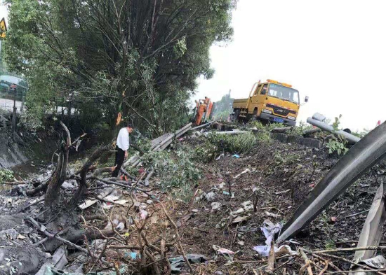7月15日上午,台州高速集团施救中心辅查员和驾驶员在核对路产损失。这是他们第三次到事故现场进行路产勘查。