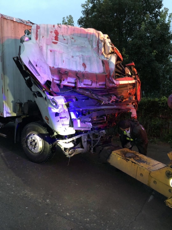 7点30分,经过半小时的努力,在辅查员在一旁指挥下,拖车用缆绳进行牵引,吊车配合,将车头放置可以正常拖曳的地方。