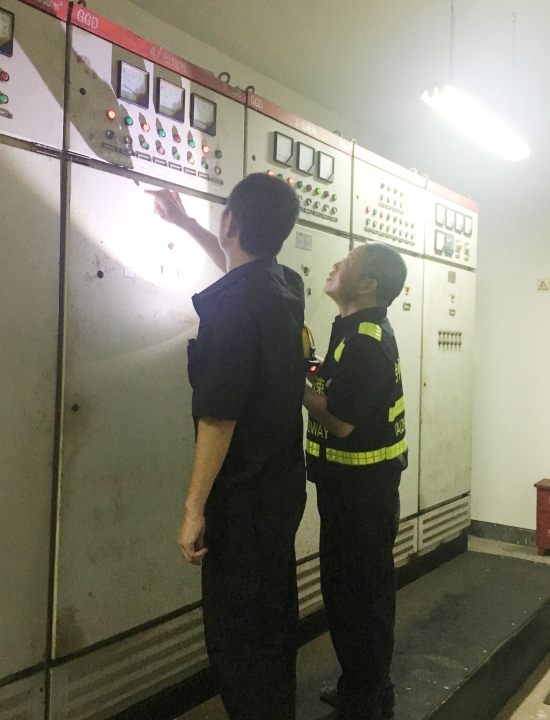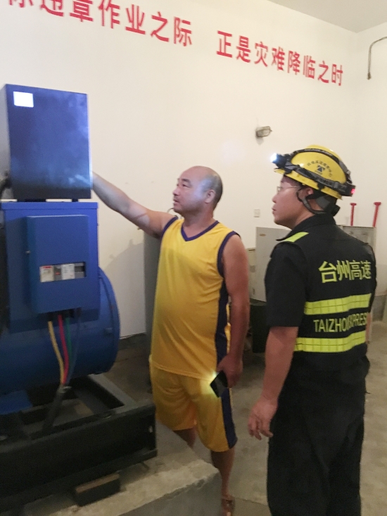 图为抢修人员查看发电机运行态况 然而仅仅过了5个小时,28日凌晨2点20分,临海南收费所的一通抢修电话将队员们惊醒,临海南收费所又断电了! 凌晨的临海南收费所笼罩在黑暗中,微风轻轻地吹着,除了蟋蟀的鸣叫,唯有抢修人员的手电偶尔划破夜空。抢修队员们很快就发现了故障原因,这次是市电B相没电,因为是凌晨,考虑到电力部门外线人员不会来修复,抢修人员决定暂时采用备用发电机发电的方式,待天亮后再联系供电部门。为了防止临海南收费所再次陷入断电困境,维养中心抢修一班班长何小敏从30公里外的张家渡连夜驱车赶到了所里,主动请缨留下来值守,待电力部门恢复正常市电后再回去。