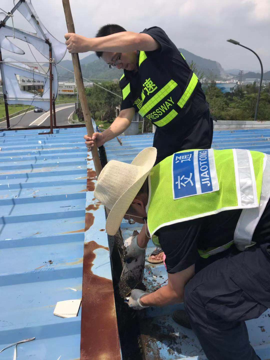 全面清除收费顶棚及下水管道垃圾。集团沿线收费顶棚经过几次的施工装修,遗留了一些装饰垃圾,如不及时清理一旦掉入排水沟或下水管道,势必会造成顶棚漏水,影响下面人员及设备安全。8月7日,维养中心组织班员在登高车协助下,顶着炎炎烈日,利用垃圾夹、铁锹等工具对沿线收费站收费顶棚上方垃圾、排水沟中的淤泥进行了逐一清理,并重新铺设排水沟上面的防护网,防止台风期间吹来的一些塑料纸袋等轻型垃圾再次堵塞下水道。