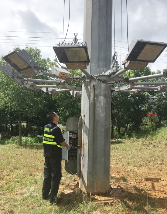 及时下降各收费所互通区高杆灯。为提升互通区照明亮度,减少因选错路口而带来的不必要的麻烦,集团在各收费站出入口互通区共安装了11盏40米高度高杆灯,每盏高杆灯上方有12盏钠灯。倘若这些高杆灯上钠灯在台风袭击下一旦掉落后果将不勘设想。8月8日,中心再次召集各班人员对收费沿线高杆灯进行了下降处理。因高杆灯四周杂草丛生,在下降时维修队员不仅要忍受底下蚊虫肆意叮咬,还要克服时而烈日时而大雨的怪异天气,没放几盏队员便湿透了全身,衣服是湿了又干,干了再湿。