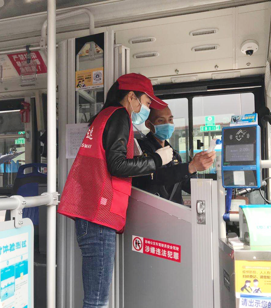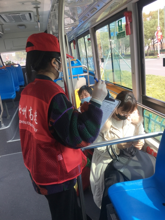 图为志愿者跟车防疫服务 “我所在的一班车来回一趟是1个多小时,疫情期出行人员不多,大家上车前都会认真配合检查。”毛译聆说道,她一次连续跟车要3个多小时。 疫情在前,国企担当,台州高速人会持续共战疫情,哪里有需要,挺身在哪里,以行动诠释高速责任,展现高速风采。
