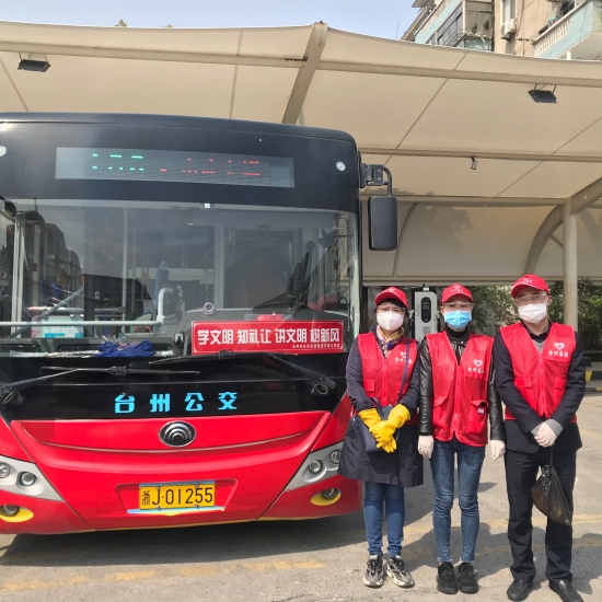 图为公交防疫志愿活动前的动员会 连日来,椒江区工人路、江滨公交首末站出现了一批穿着红色马甲的志愿者,他们是台州高速“公交防疫员”,跟车服务上车的乘客,做好防疫安全检查。跟车前,每名志愿者都会经过简单的培训,认领各自的职责。