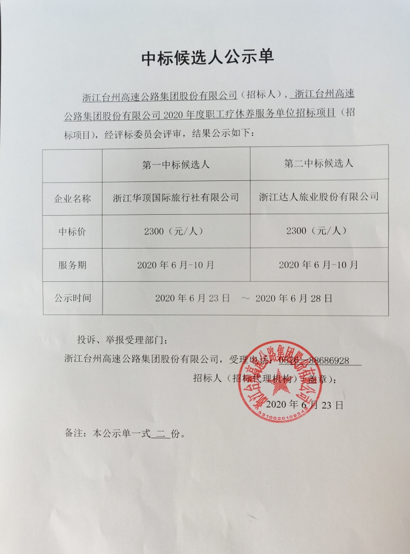 2020年度职工疗休养服务单位招标项目中标候选人公示单